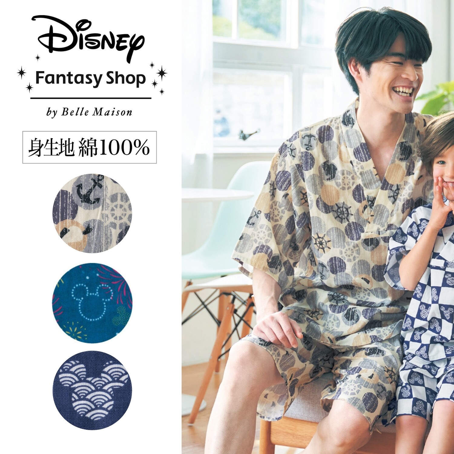 メンズ綿100%ダブルガーゼ かぶり甚平パジャマ「ミッキーモチーフ」