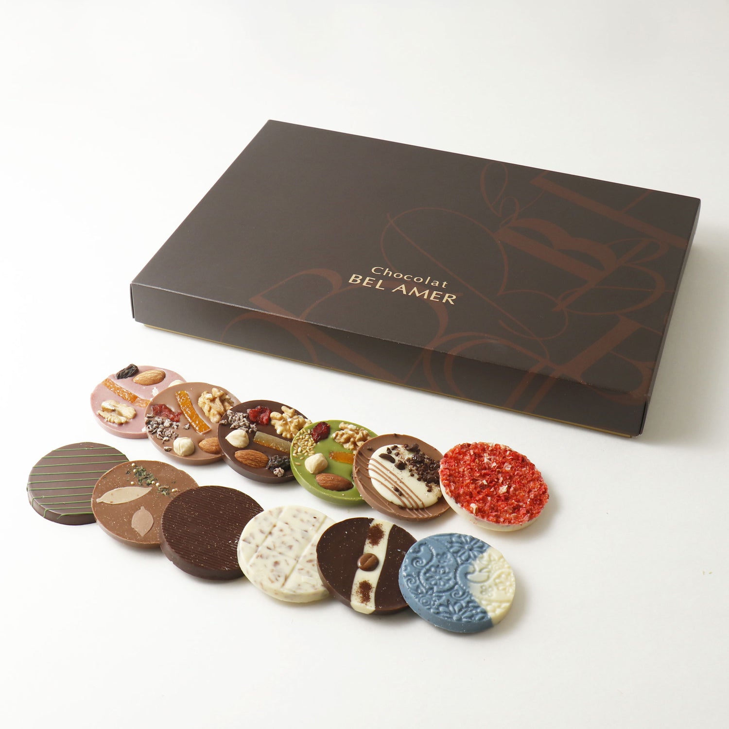 ベルアメールの中で最も人気の「パレショコラ」の詰め合わせ。香ばしいナッツや凝縮された甘みのドライフルーツなど、1枚ごとに異なるトッピングがアレンジされています。味と一緒に目でもじっくり楽しみながら、じっくりと味わいたい一品です。