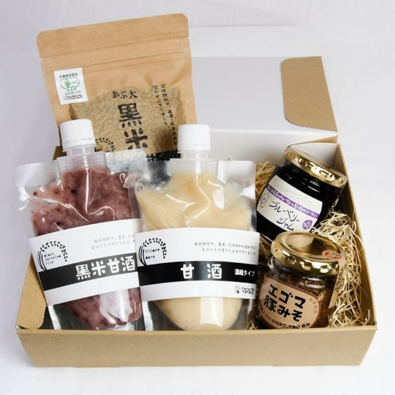 飲む点滴と言われる人気の甘酒をはじめ、自家栽培の農産物加工品が詰まった「福福堂」の人気ギフトセット。身体に良い黒米や甘酒、朝食に嬉しい豚みそやブルーベリージャムなどがバランスよく入った一品です。