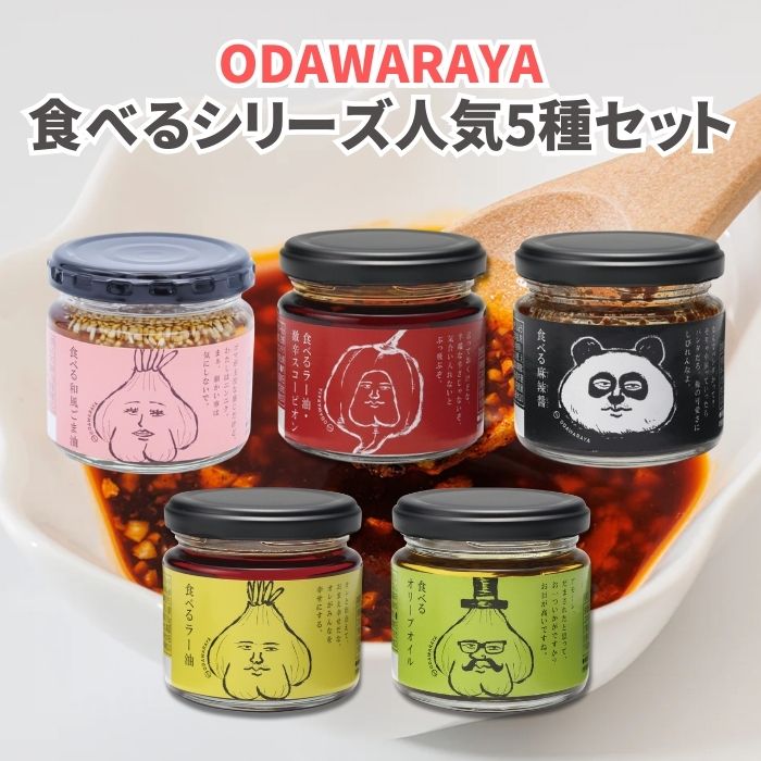 今ではすっかりお馴染みになった「食べるラー油」の他、オリーブオイルや麻辣醤など、人気5種がセットになったギフト。フライドオニオンやガーリックのザクザク食感が癖になる美味しさ。思わず笑ってしまう個性派イラスト&キャッチコピーのラベルも魅力。
