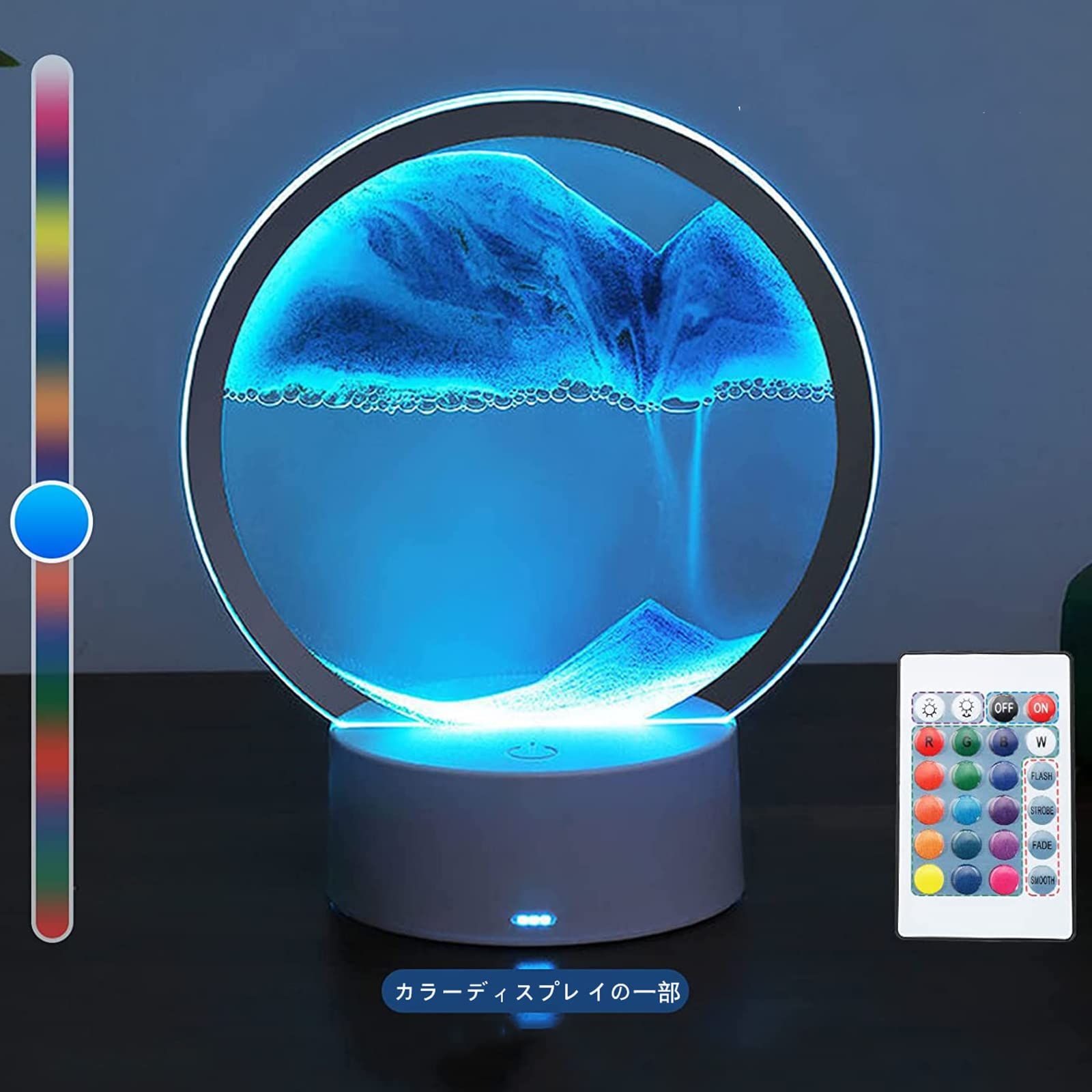 スタイリッシュなラウンドフレームを動かすと、中に閉じ込められた色の異なる砂がサラサラと落ち、毎回違った光景に。 LEDライトをつければ、夜もまったり癒されること間違いなし。