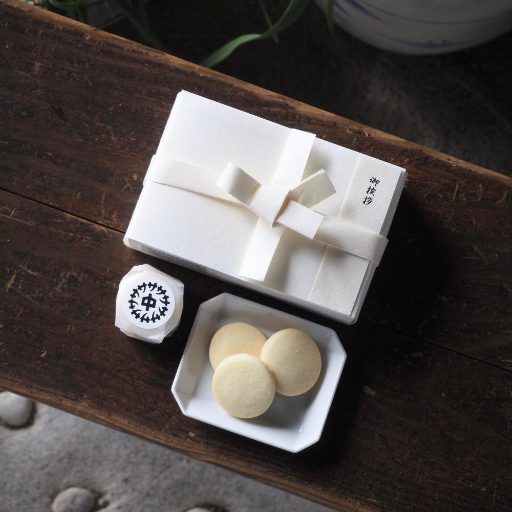 伊勢神宮で神様にお供えする「ご神饌」をモチーフにしたクッキー。三重県産の小麦粉と米粉、北海道産のバターをベースにした、素朴で優しい味わい。サクサクとした軽い食感。ほのかな海塩と酒粕の風味がアクセント。梱包には御札で使う伊勢和紙で作られた「結び目」を添えて。