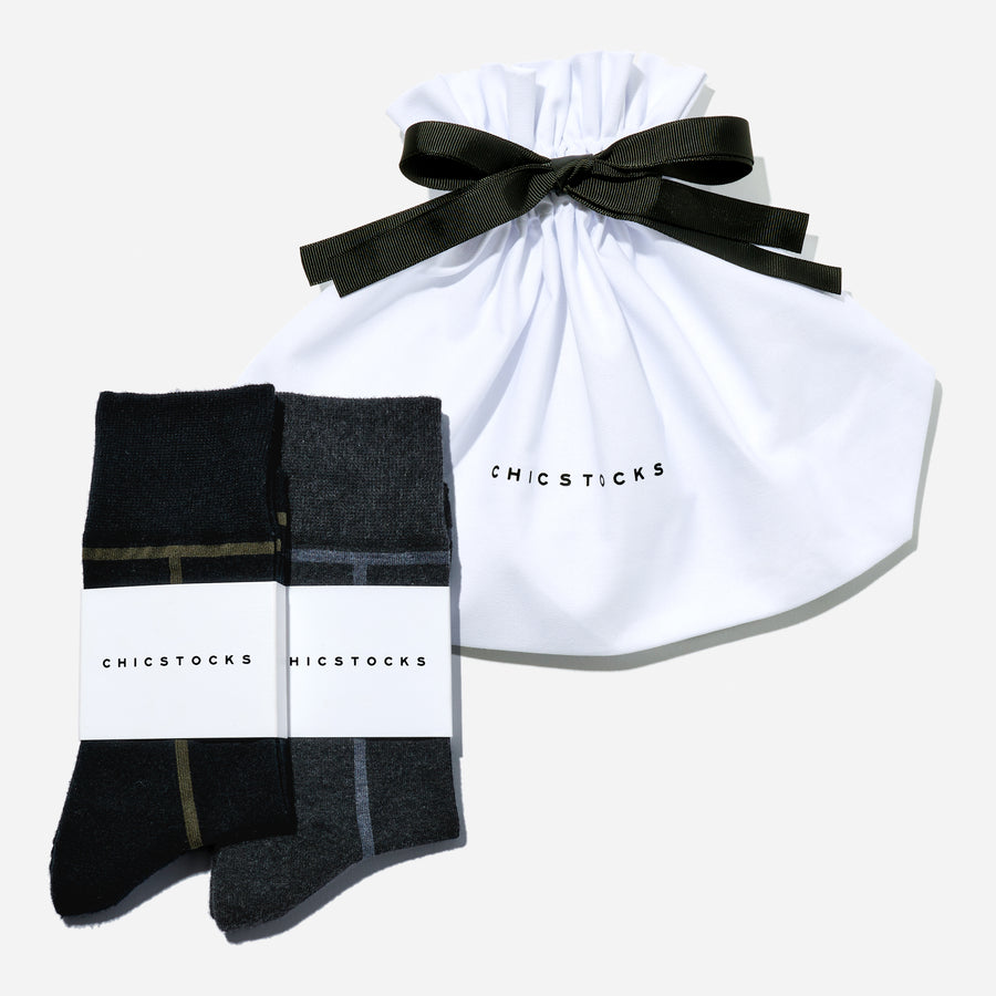 「CHICSTOCKS」のラインソックスは、縦ラインが特徴的なおしゃれアイテム。長めの履き口で圧力を分散し、締め付けが少なくてもずれ落ちにくい工夫が施されているなど見た目だけでなく履き心地や機能性も魅力的。ギフトセットなら、品の良さも感じますね。