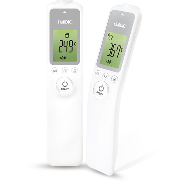 こちらの「HuBDIC」の体温計は非接触型なので、こめかみにかざすだけで2秒以内に測定可能。正常値・微熱・高熱の3段階でバックライトの色が変わります。