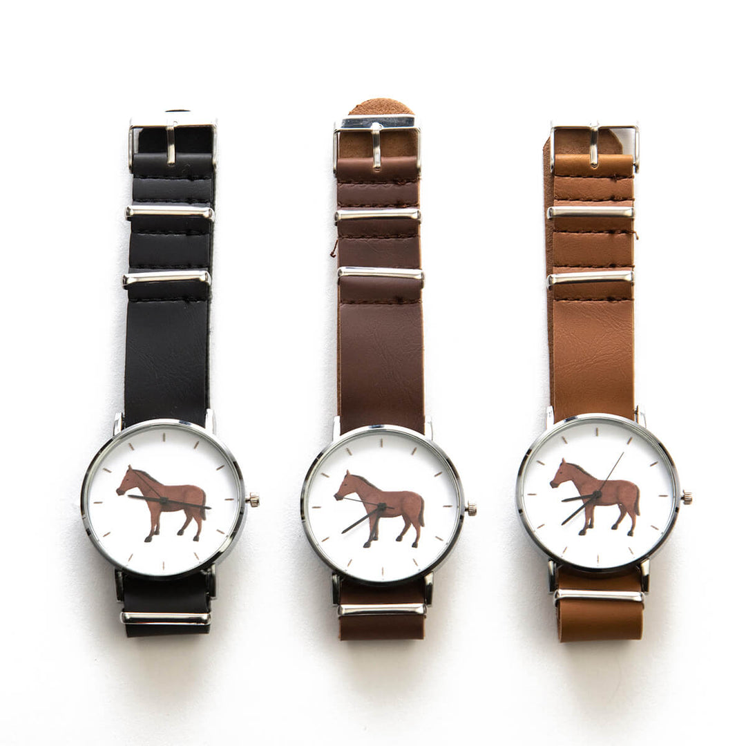 こちらは、なんだか少しほっこりするお馬さんデザインの腕時計。シンプルながらも馬がアクセントになった洒落たデザイン。水彩画タッチのイラストは、ずっと眺めていたくなる魅力がありますね。ブラウン・ブラック・キャメルの3色から選ぶことができますよ。