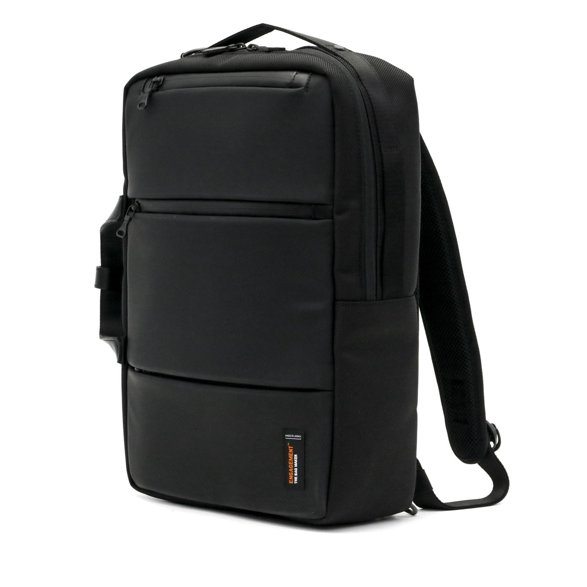 ENGAGEMENT(エンゲージメント)のビジネスリュック。3WAY仕様で手持ちやショルダー、キャリーに付けられる、縦横どちらでも使い勝手の良いデザイン。撥水性のあるオリジナル素材を使用しています。フロント部分にあるポケットは、スマホやパスケースの収納に便利。