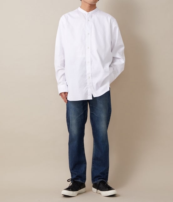 こちらはバンドカラーの白シャツ。カジュアルなスタイルですが、織目がきめ細かなピンオックス素材を使用することで、上品な印象にまとめています。洗うたびに表情が出るので、経年変化を楽しめる1枚。